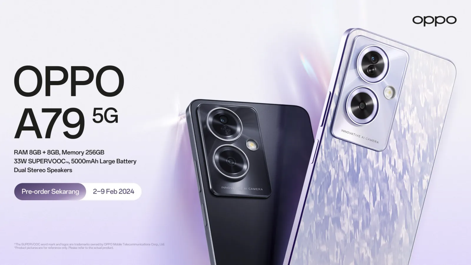 OPPO A79 5G hadir dengan desain yang indah dengan pilihan warna Glowing Purple dan Mystery Black, serta punya baterai besar dan kamera utama 50MP.